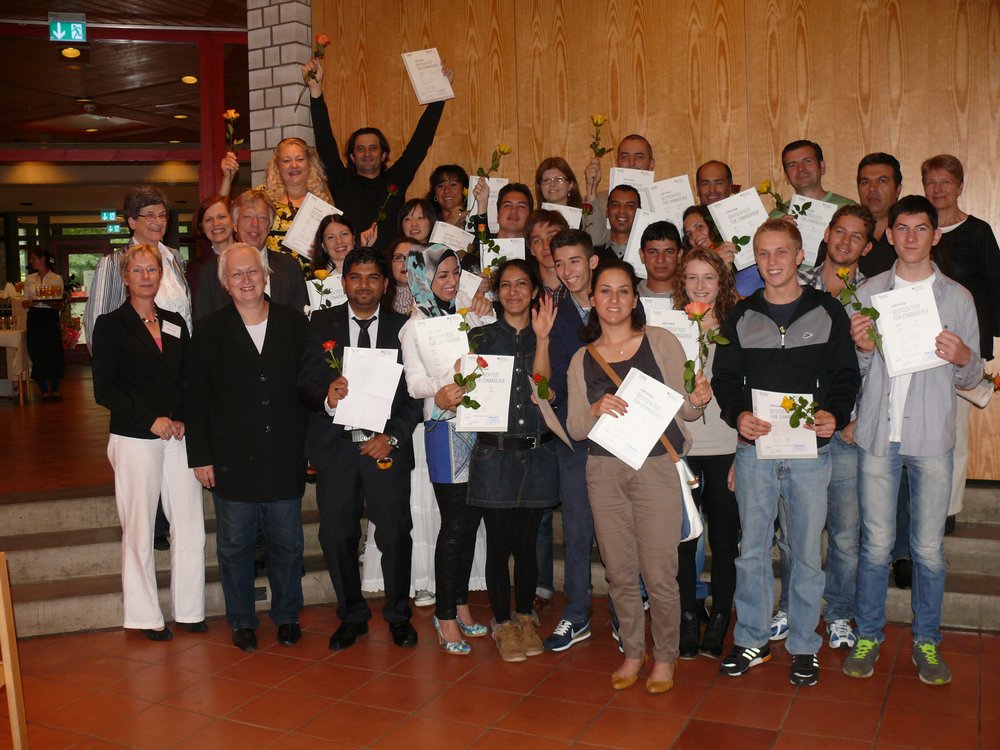 Deutsch in sieben Monaten zu lernen ist keine leichte Hürde. Intensiv hatten die ausländischen Schülerinnen und Schüler aus 12 Ländern für die schriftliche und mündliche Prüfung gebüffelt, die gemäß den Bundesvorschriften stets externe Prüfer vornehmen. Alle haben das Ziel erreicht. Im Haus der Begegnung in Elmshorn erhielten sie bei einer festlichen Feier von Karen Fischer, der pädagogische Leiterin der Integrationskurse im Diakonieverein Migration e. V., das wichtige Zertifikat überreicht. „Alle Teilnehmerinnen und Teilnehmer haben außerdem den Test „Leben in Deutschland“ erfolgreich bestanden“, freute sich Karen Fischer. Aus dem gesamten Kreis Pinneberg, von Itzehoe über Elmshorn bis Uetersen hatten Menschen mit Migrationshintergrund an den Kursen teilgenommen. „Verwahren Sie das Zertifikat gut“, empfahl Fischer, „Sie werden es bei einer Ausbildung, bei Bewerbungen für Praktika und eine Anstellung brauchen.“
